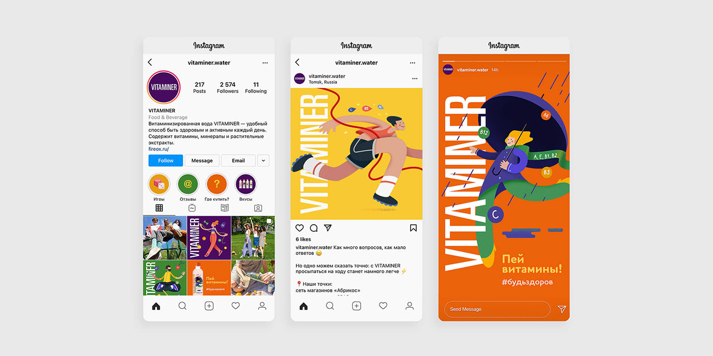 維生素系列的開頭有四種飲料:運動、放松、免疫、零。每個人都有自己的口味、自己的維生素和礦物質(zhì)雞尾酒以及自己的性格。在運動瓶上,一位跑得快的人沖破了終點線;在免疫瓶上,一位不怕感冒的開朗少女在雨中行走。在“放松”中,一個寧靜的瑜伽士以蓮花姿勢放松,在“零”中,一個健康的女孩清楚地監(jiān)控飲食中的糖分含量,開始訓(xùn)練。