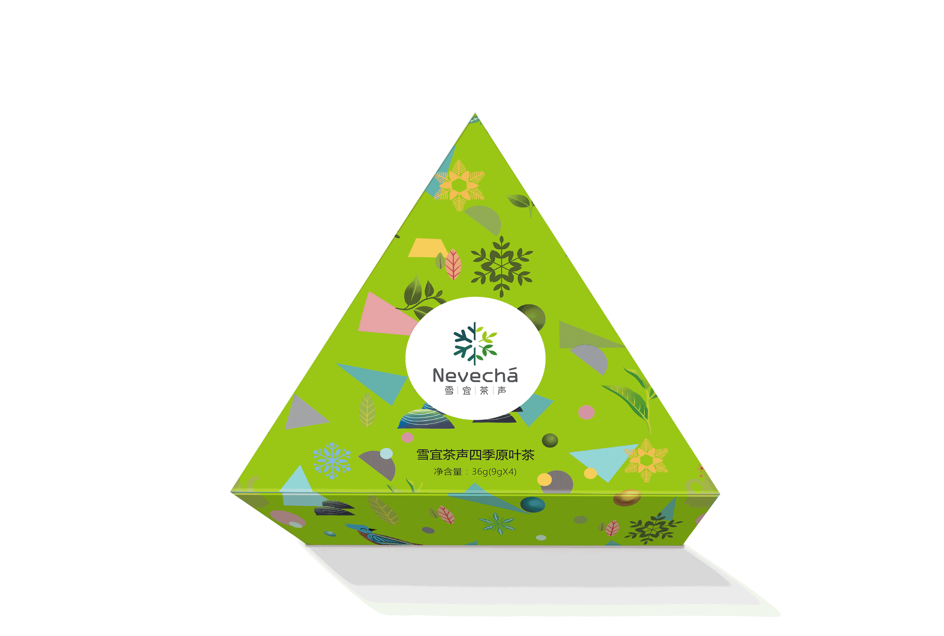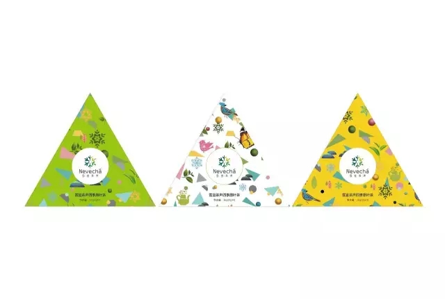 設(shè)計(jì)元素采用“雪宜茶聲”LOGO標(biāo)識為主題,增加品牌識別度和市場印象;禮品包裝插畫風(fēng)格,運(yùn)用雪花、茶壺、小石塊、綠色植物、鳥蟲等元素,勾勒出一幅生態(tài)、自然、安逸場景,突出包裝清新自然的視覺效果;包裝盒采用三角型的形式設(shè)計(jì),即便于禮盒裝的組成,又突出年輕人對喝茶的一種精神訴求,喝茶就是享受生活,追求夢想,釋放青春的一種平衡性;內(nèi)包裝盒色調(diào)根據(jù)不同茶類型,選用不同色彩,但整體視覺主要以淡雅、粉嫩為主,即符合茶的原本形態(tài),又迎合了時(shí)尚化、年輕化創(chuàng)意。