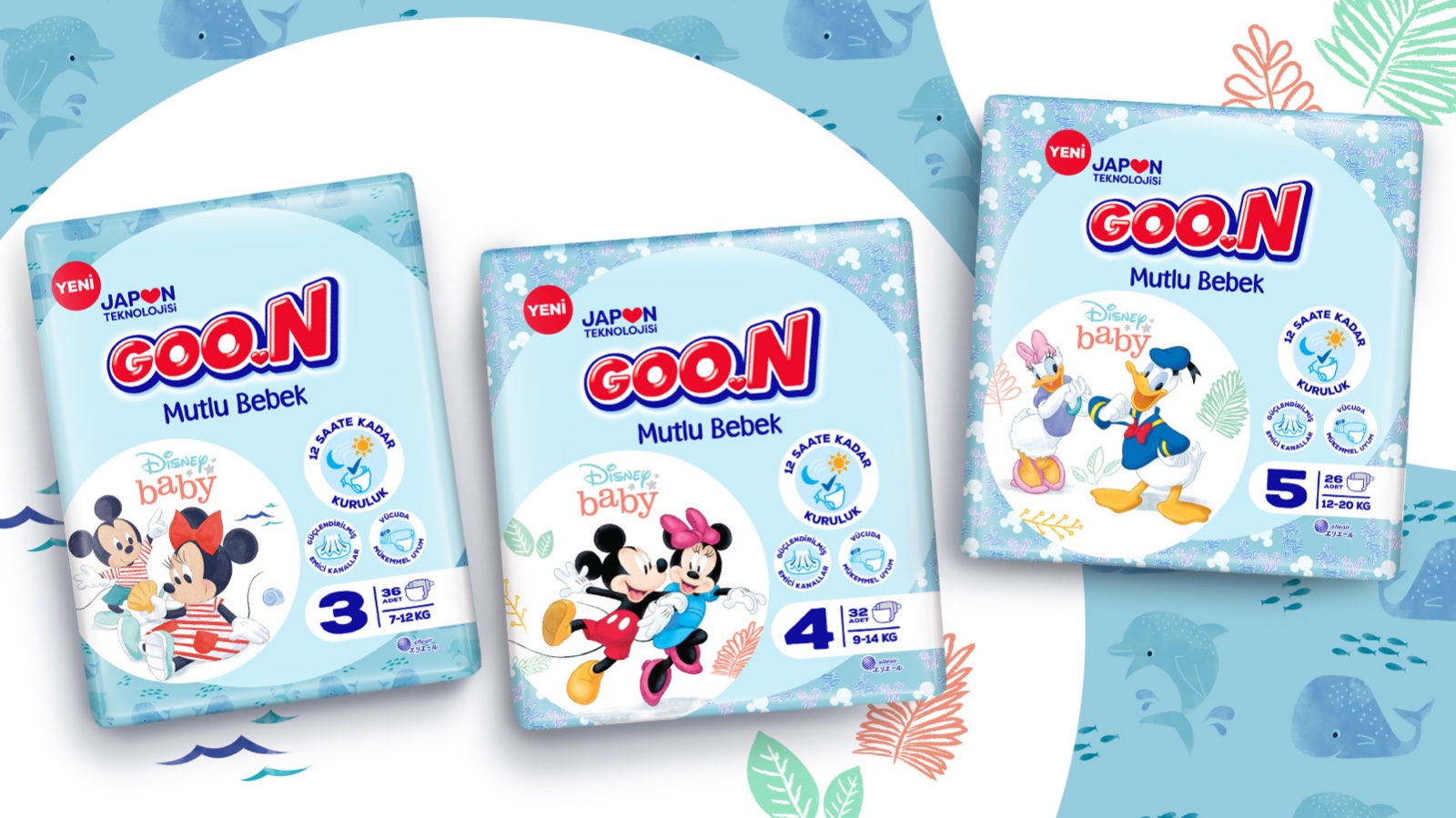 Goon 嬰兒紙尿褲有兩個(gè)子品牌:Mutlu Bebek(Happy Baby)用于標(biāo)準(zhǔn)嬰兒紙尿褲,Premium Soft 用于上段。為了給 Goon 紙尿褲創(chuàng)造一種通用的視覺語言,我們創(chuàng)建了一個(gè)圓形的品牌架構(gòu)。靈感來自標(biāo)志中 GOO 字母的圓形形式。對于 Goon Premium Soft,標(biāo)志下方的金色圓圈是建筑的主要視覺元素。金色代表品牌的高端定位。另一方面,對于 Mutlu Bebek(Happy Baby),在白色圓圈內(nèi)使用了授權(quán)的迪士尼角色,并使用了幼稚的藍(lán)色來與母親們建立更真誠的溝通。盡管圓形形式為 Goon 品牌架構(gòu)創(chuàng)造了一種共同語言,它們不同的尺寸和位置為子品牌提供了差異化。產(chǎn)品功能變成了帶有插圖的圖標(biāo),這些圖標(biāo)是專門為 Goon 品牌架構(gòu)創(chuàng)建的。