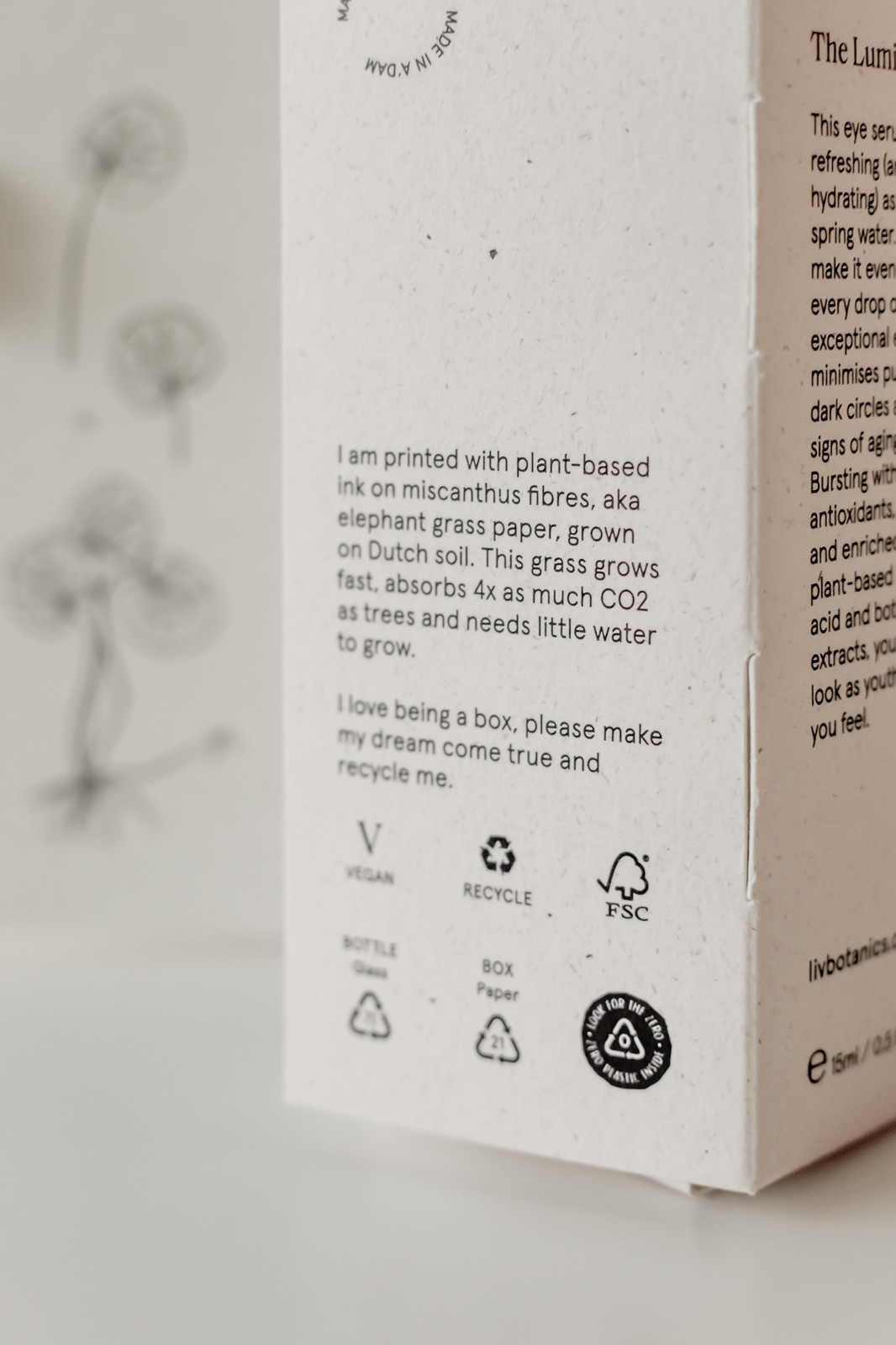 為了最大限度地減少品牌的碳足跡,我們在距離阿姆斯特丹市幾公里遠(yuǎn)的大象草纖維上使用植物基無毒墨水進(jìn)行本地印刷。主包裝盒不使用膠水,展開平展,展示每種產(chǎn)品中包含的關(guān)鍵成分的植物圖及其植物名稱和信息。用于瓶子和罐子的標(biāo)簽不含塑料,而用于運(yùn)輸?shù)亩壈b、紙帶和包裝紙是 100% 可回收和可回收的,并使用無毒的植物性油墨印刷。