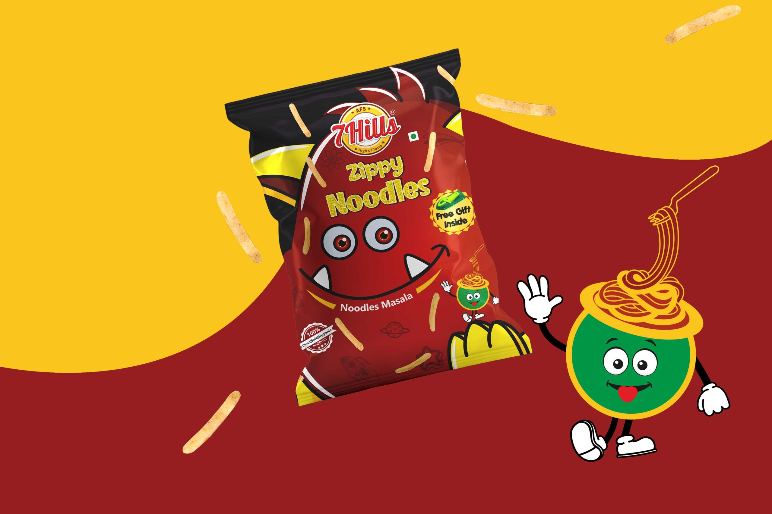 馬薩拉面:這個(gè)包裝的設(shè)計(jì)考慮了馬薩拉面的美味。包裝上的文字是一碗面條,是通過(guò)繪畫(huà)創(chuàng)作的。這個(gè)設(shè)計(jì)的中心人物是深紅色。