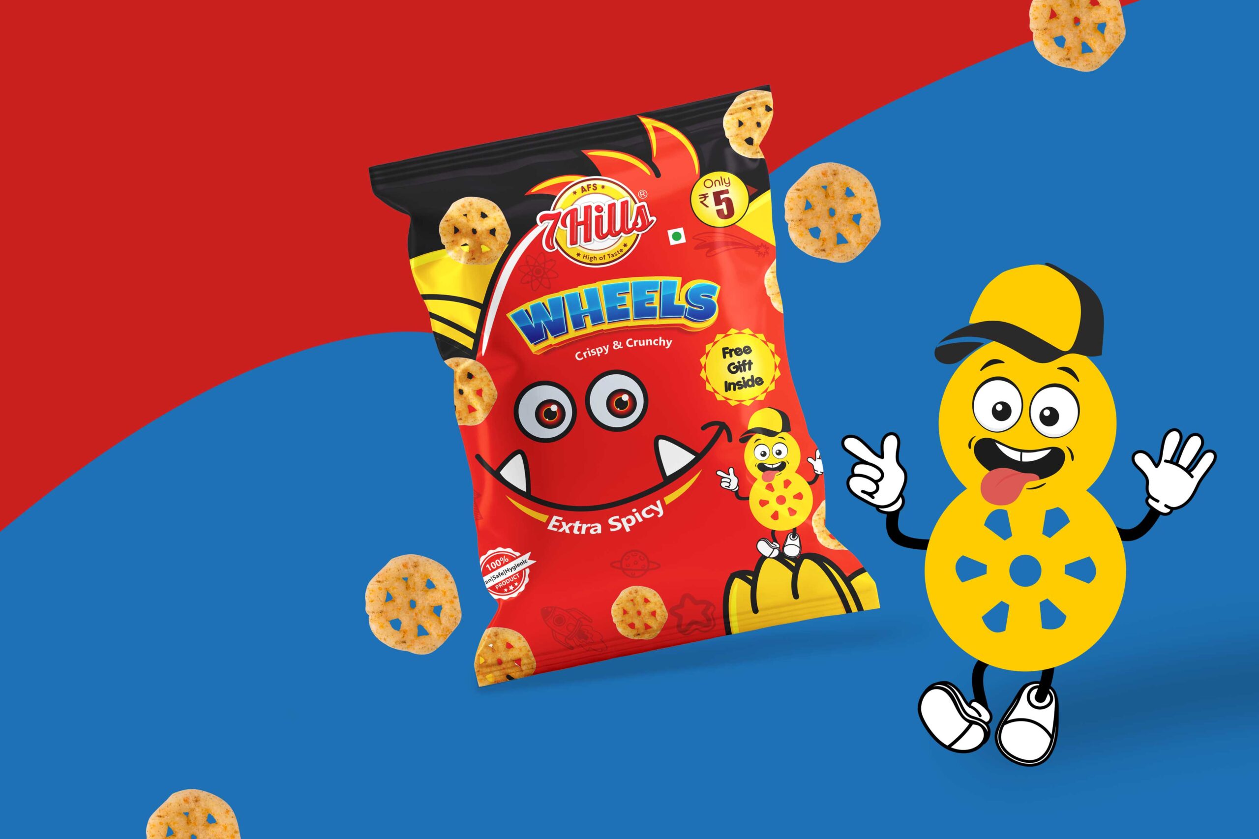 辛辣車(chē)輪:這款包裝的設(shè)計(jì)考慮了辛辣口味的脆車(chē)輪。包上的字符是一個(gè)有趣的輪子字符,由繪圖創(chuàng)建。這個(gè)設(shè)計(jì)的中心人物是紅色的。由于增加了有趣的角色,這些包對(duì)孩子們來(lái)說(shuō)變得更具互動(dòng)性。