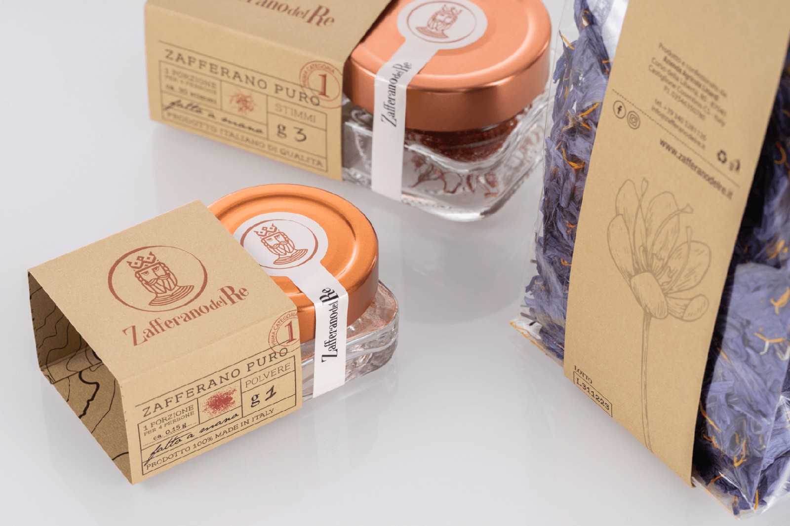 像國王寶藏中的黃金那樣的貴重產(chǎn)品,以純藏紅花的形式分布在柱頭和粉末中,像食用花卉一樣干燥,加到蜂蜜中成為原始的Smielace,與面粉混合后變成L'oro del Busento。每個包裝都是用手封閉的,即使是單劑量包裝的密封圈也帶有紅色螺紋接縫。每包中都包含一張藏寶圖,以強(qiáng)調(diào)藏紅花的概念:藏寶。